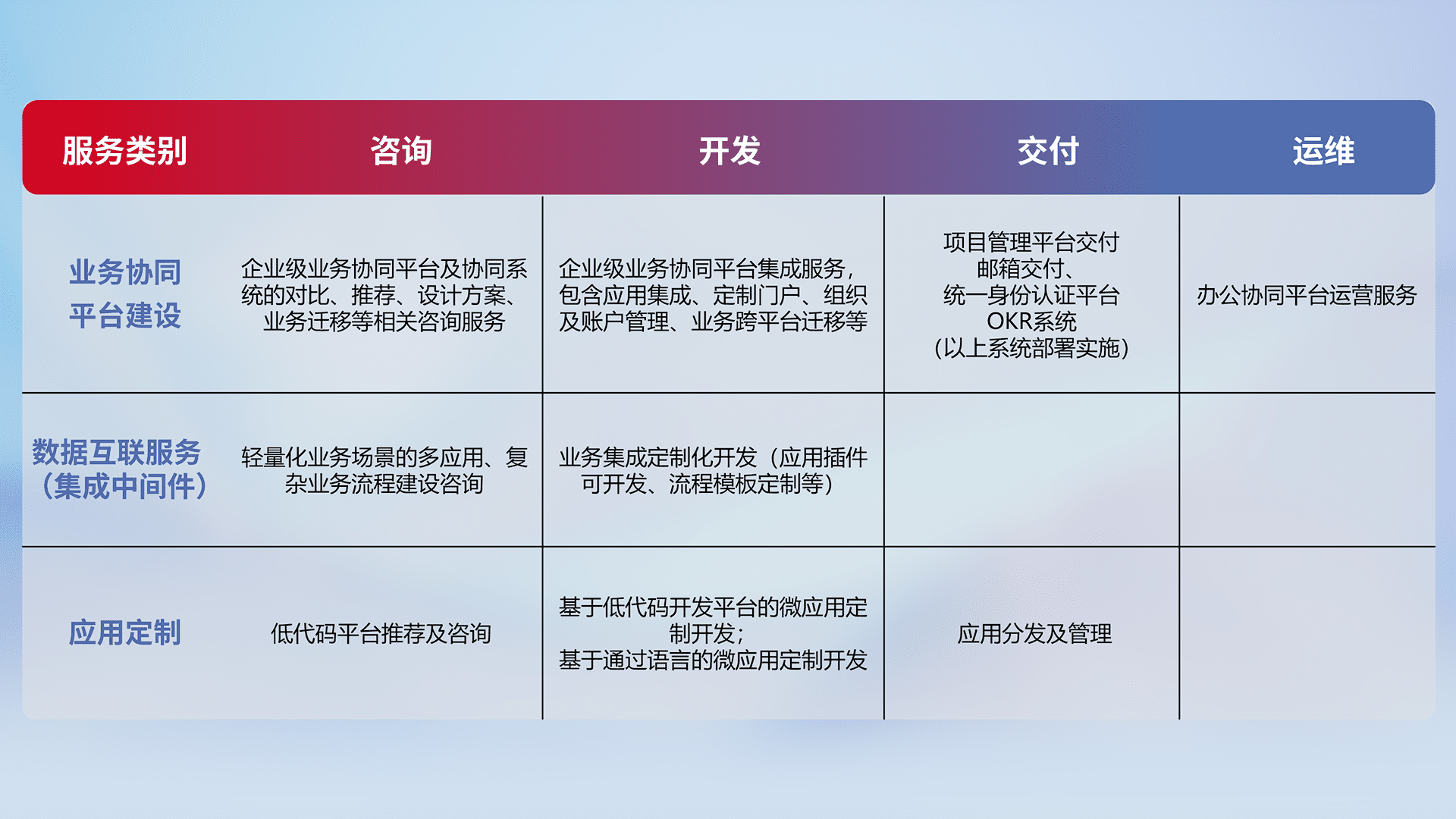 针对钉钉、、、、企微、、、IDaas等平台级产品提供产品的规划、、、方案、、交付、、定制化开发等服务,,实现如统一协同办公、、、智能客户服务、、混合会议管理、、智能数据查询、、、等业务场景,,,,实现数字化转型。。。